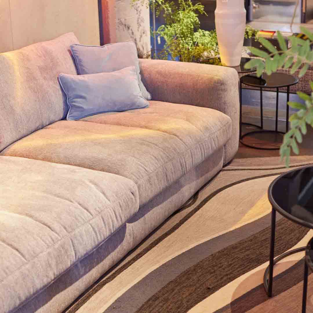 Ein Kunstwerk für den Boden, das durch seine organischen Wellenlinien und die abgestuften Erdtöne eine beruhigende Atmosphäre schafft. 250 x 350 cm; 100 % Polypropylen, outdoorgeeignet, div. Ausführungen